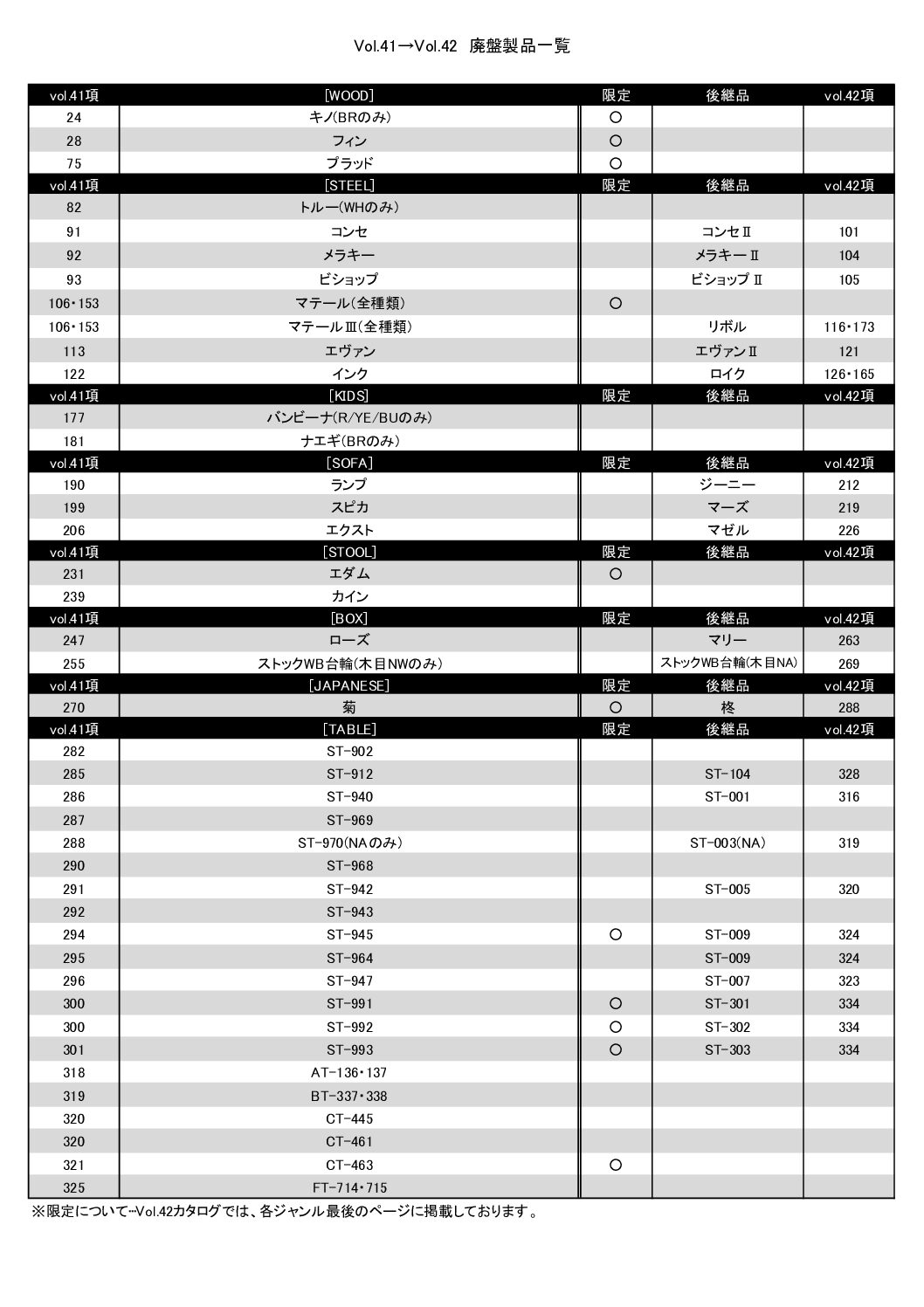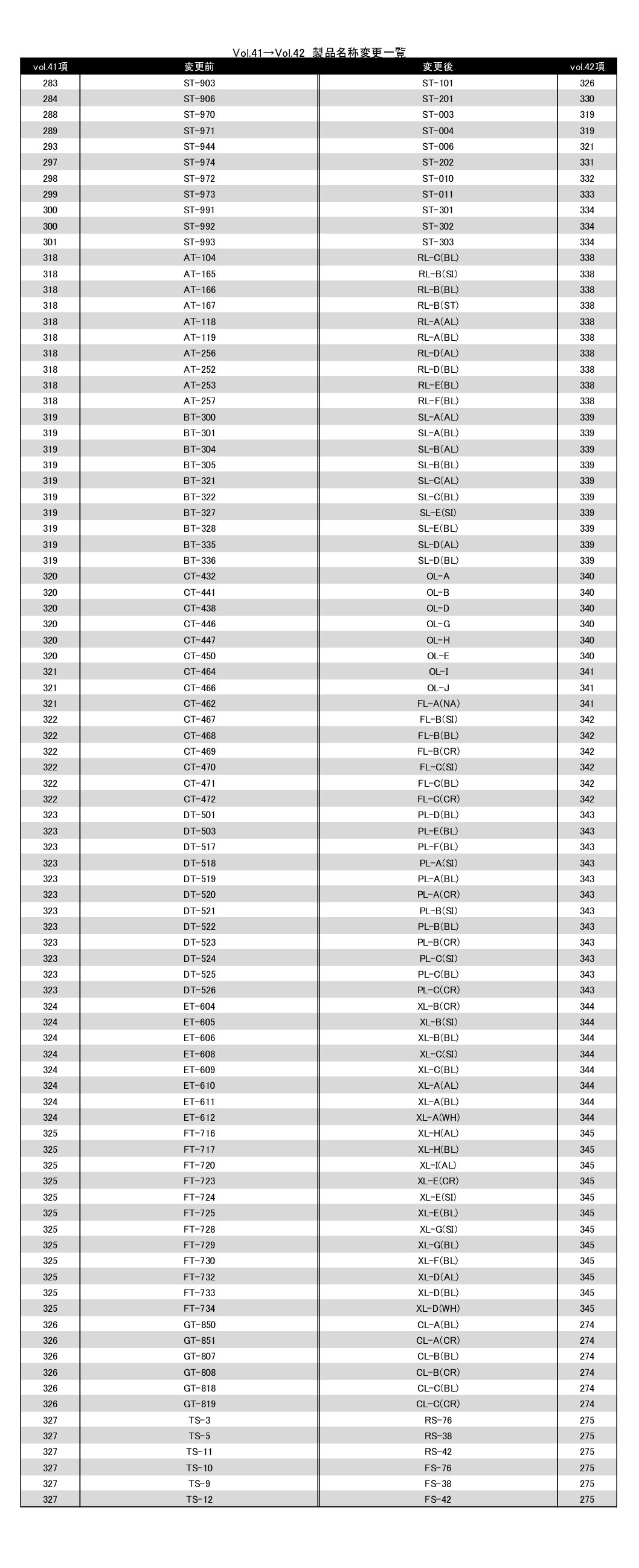当社カタログのVol.41からVol.42への切り替えに伴い、廃番商品および製品名変更に関する一覧を掲載いたしました。